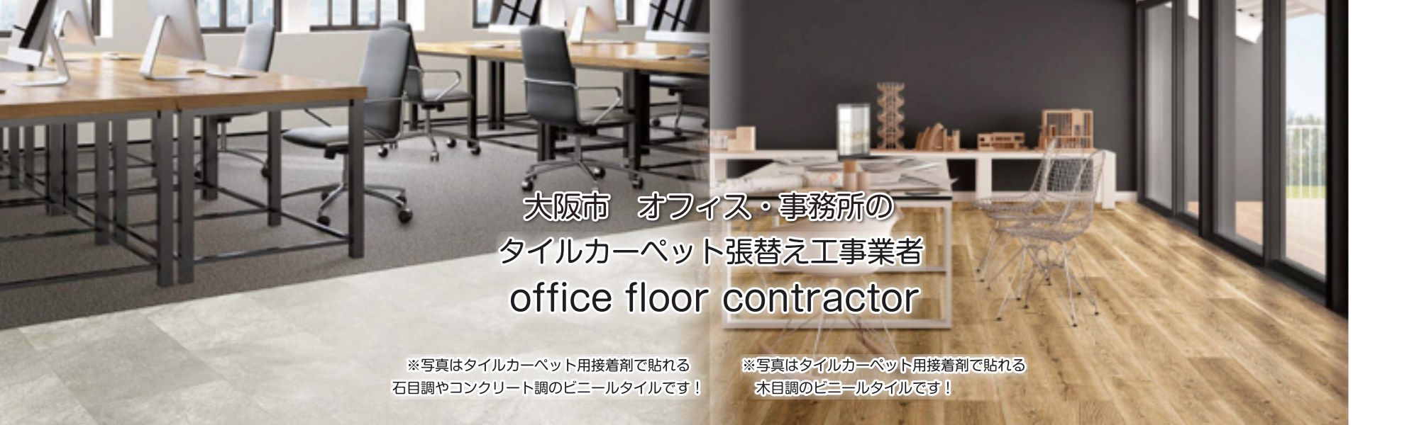当社は大阪市のオフィス・事務所のタイルカーペット等の床材の張替え(貼替え)工事を格安価格で行わせていただいております工事業者です。二重床構造床(フリーアクセスフロア・OAフロア)設置工事やブラインド取替工事やパーテーション設置工事・稼働間仕切設置工事も行わせていただいております。